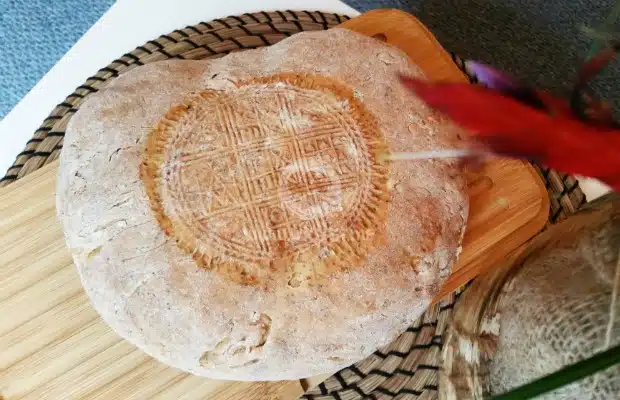 Поставяте в тавичка покрита с хартия за печене. Аз украсих питката с печат, който имам от моята прабаба, но това не е задължително. Питката се пече в предварително загрята фурна на 180-200°C за около 20-25 минути.