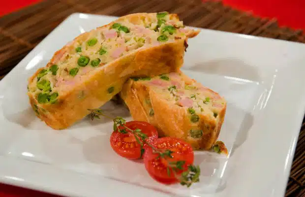 Нарязваме част от пекориното на лентички, другото го настъргваме. В купа изсипваме брашно и счупваме яйца. Прибавяме маята, прясно мляко, зехтин, настъргано пекорино, грах и бекон.