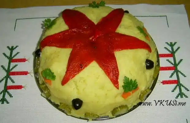 Сварявате картофите и ги пасирате. Добавяте маслото и прясното мляко и ги разбърквате на пюре. Половината картофено пюре се слага на дъното на чинията и отгоре се редуват всички продукти на редове. Като за целта яйцата се настъргват, а салама, чушките и краставичките се нарязват на дребно. Отгоре се слага останалото пюре и се оформя като торта. От трите печени чушки правите звезда. Украсете с маслини, печени чушки, моркови, краставички и магданоз.