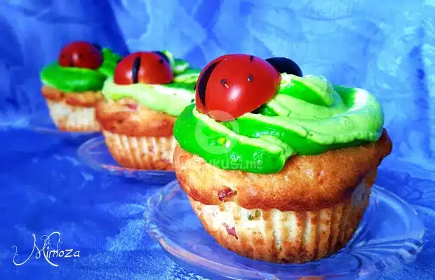 Маскарпонето и заквасената сметана се разбиват с миксер. Добавя се боята. Кремът се шприцова върху вече изстиналите кексчета. Украсяват се с калинки, направени от чери доматчета и маслини.