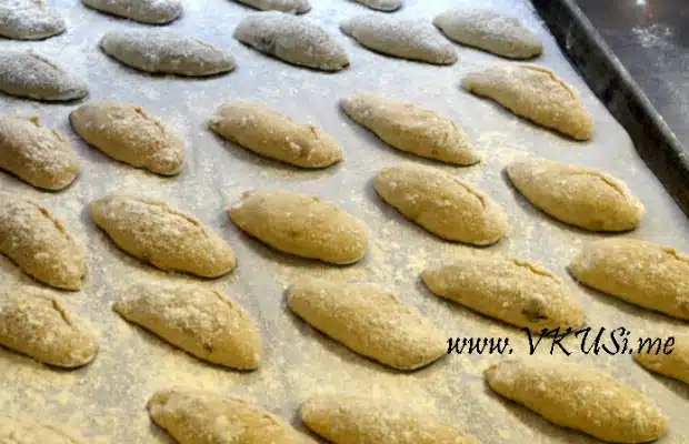От всички продукти се замесва меко тесто, къса се от него и се правят малки топчета. Издължават се леко и се поставят в тавичка, покрита с хартия за печене. Поръсват се леко с брашно и се пекат в умерена фурна за около 15 минути.