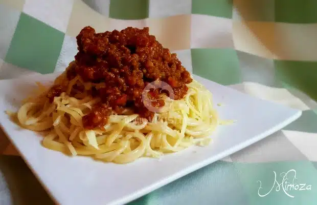 Бърза вечеря за прегладнели! Моят вариант на спагети Болонезе, любими на цялото семейство. Можете да замените лютеницата с доматено пюре, а ако ливнете и малко червено вино на запържената кайма, направо можете да махнете „ала“ от заглавието. 🙂
