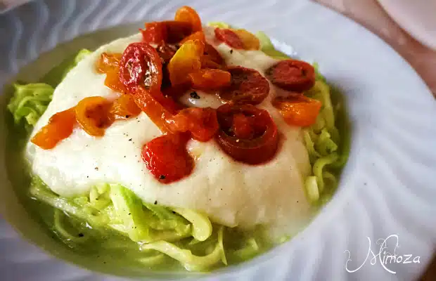 Тиквичките се прехвърлят в чинии. Всяка пориця се залива с половината от соса и отгоре се разпределят чери доматите.
