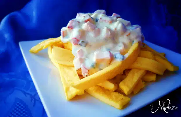 През това време се приготвя соса. В малко зехтин се запържват ситно нарязаните лук и шунка. Заливат се със сметаната, овкусяват се с черен пипер и се прибавя настъргания кашкавал. Бърка се, докато се разтопи кашкавалът и сместа се дърпа от котлона.