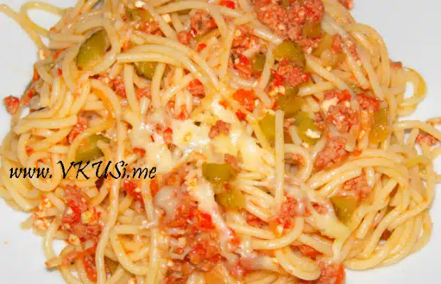Спагетите се сваряват до готовност, измиват се със студена вода и се прецеждат. В тиган се запържват каймата и нарязаният лук. През цялото време на пържене с дървена лъжица се наситнява каймата.