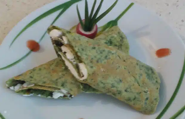 От яйцето, млякото и брашното приготвяме палачинковата смес. Посоляваме, добавяме и спанака и разбъркваме. В загрят тефлонов тиган изпичаме палачинките и от двете страни. Намазваме ги с масло, поръсваме със сирене и ги навиваме. От тази доза излизат 3 броя палачинки.