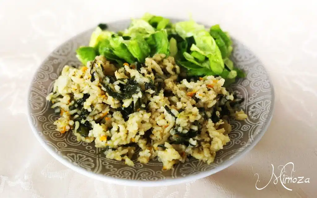 Лукът се нарязва на ситно, морковът се настъргва и се задушават в малко зехтин. След 2-3 минути се прибавя измития ориз, чубрица и черен пипер. Когато оризът стане прозрачен, се прибавя почистения от жилите и нарязан на едро спанак. След като се свие, ястието се залива с 2 ч.ч. вода, посолява се и се оставя да къкри на среден огън до готовност.