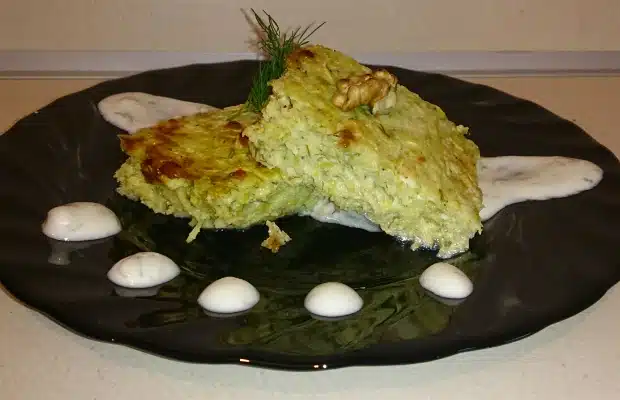 В намаслена тавичка поставяме сместа и слагаме малки бучки масло на няколко места. Печем до златиста коричка в умерена фурна (около 20/30 минути на 180-200 градуса). Поднасяме с млечен сос.