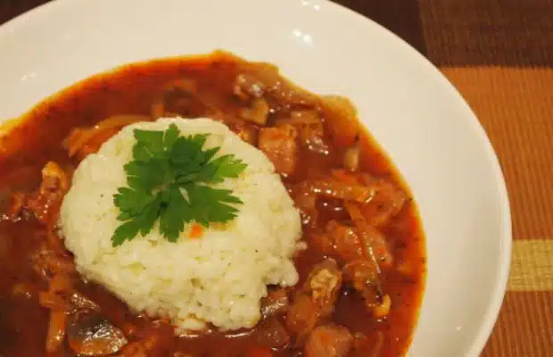 Връщаме месото и добавяме червеното вино. След като сместа заври, слагаме капак на съда и оставяме на котлона да ври до готовност на месото. Гарнираме с ориза и стръкчета магданоз.