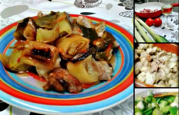 Празът се нарязва на едри парчета и с него се постила дъното на тавичка. Отгоре се изсипват свинските парчета и тавичката се завива с алуминиево фолио.
