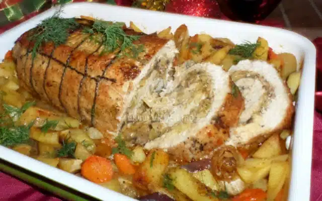 Преди да станат напълно готови сложете в средата свинското руло и допечете до неговото зачервяване. Поливайте от време на време рулото със соса, за да не изсъхне. След като го извадите от фурната поръсете с нарязан на едро копър.