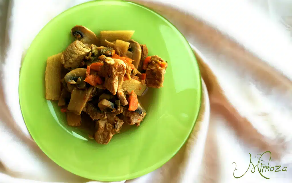 Когато на щанда в магазина видях бамбук в буркан, веднага се сетих за този, който съм яла в китайките ресторанти и много ми е харесвал. Затова напълно импулсивно го взех и спретнах тази импровизация – свинско с бамбук.