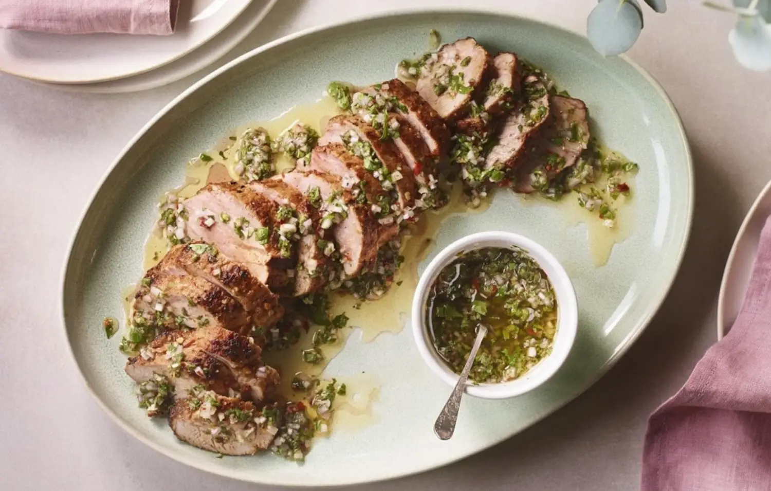 Ако ти се иска да излезеш за малко от обичайното „свинско с гарнитура“, тази рецепта е точно на място. Чимичури сосът променя изцяло усещането – добавя свежест, лека киселинност и билков вкус, който прави месото по-интересно.