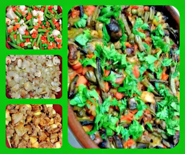 В тава се подреждат на редове обелените и нарязани картофи, месото и гъбите. Най-отгоре се завършва с граха, морковите, нарязани на кубчета, броколите на розички, карфиола и зеления фасул.