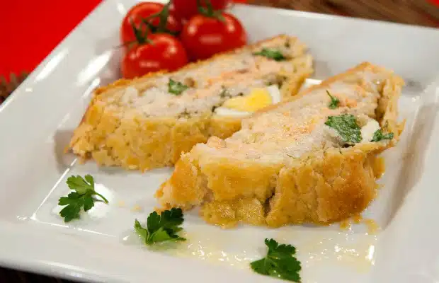 Сваряваме ориза и яйцата. Нарязваме лук на ситно и го запържваме в зехтин. Нарязваме сьомгата и сварените яйца на две. Слагаме тестото в тавичка, върху хартия за печене, и в средата сипваме ориза, отгоре нареждаме парченца сьомга. След това допълваме с лук, ориз, сьомга и накрая сварените яйца.