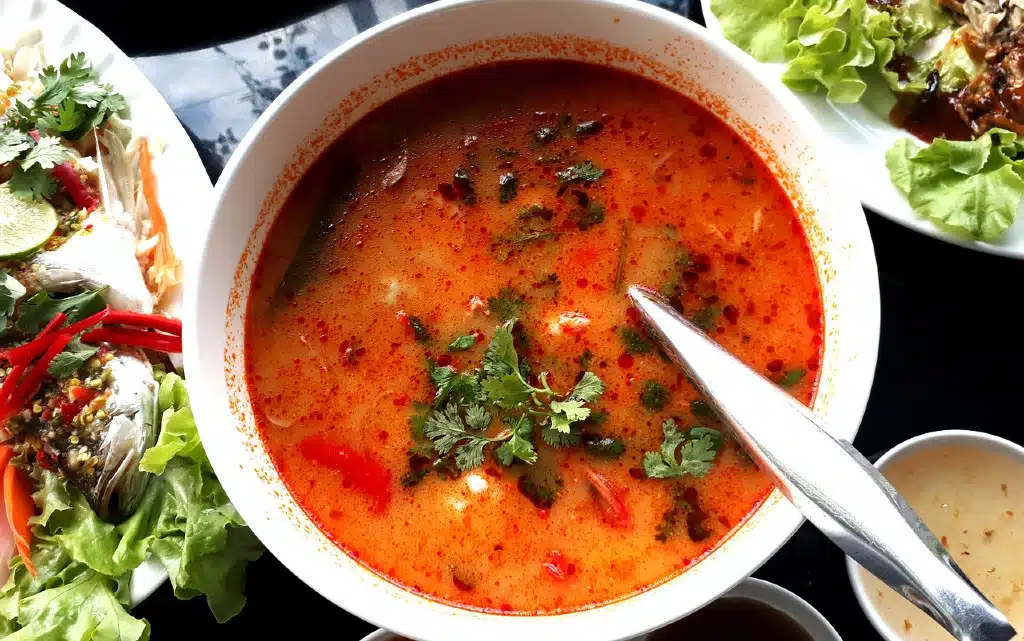 Прибавете лимоновата трева, корените кориандър и галангал (сиамски джинджифил), лютите чушки и листата от лайм и разбъркайте, за да се смеси всичко. Налейте водата или бульона и оставете да заври. Намалете температурата от умерена до ниска и оставете да къкри леко за 20 минути.