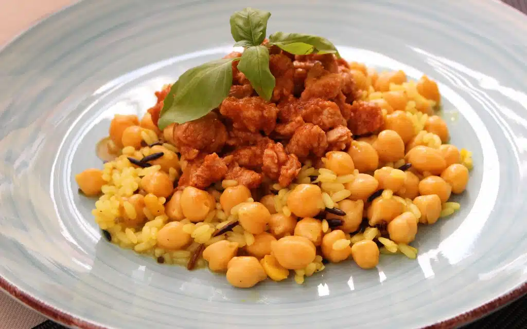 Когато течността почти се изпари, добавяме куркумата, малко черен пипер и сол (ако бульонът не е достатъчно солен). Изсипваме вътре и нахута. Оставяме за още 5 минути на котлона. Поднасяме телешкото върху канапе от ориза и нахута.