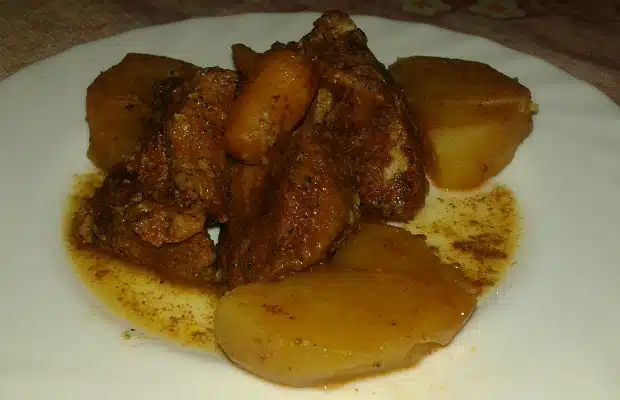 Месото, нарязано на по-едри парчета, овалваме в смес от сухите подправки. Интересният вкус тук идва от пушения червен пипер, който е изключително ароматен. Поставяме месото върху картофите. Чесънът слагаме на цели скилидки и после отстраняваме, но може и да го добавите скълцан на ситно.
