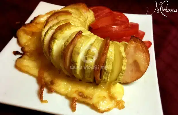 Тиквичките се почистват и се нарязват на тънки филийки напречно, без да се разрязват до края. Поставят се в покрита с хартия за печене тава и се запичат за 10 минути в предварително загрята на 180’С фурна.
