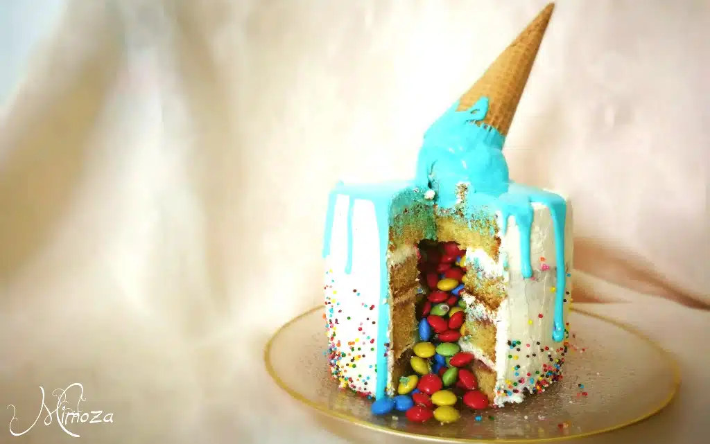Изрезките се натрошават и се смесват с 1-2 с.л. от крема. От получената смес се оформя топка. Тя се поставя най-отгоре на тортата. 50 мл сладкарска сметана се загрява и към нея се прибавя нарязания на ситно бял шоколад. Разбърква се добре, докато се получи кремообразна смес. Смесва се със сладкарската боя. С получения ганаш се залива топката и едната страна на тортата, така че да се получи ефект на резтечен сладолед. Вафлената фунийка се намазва с малко от ганаша в основата си и се слага върху топката.