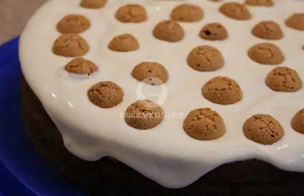 Редим тортата като напояваме всеки блат с малко вишновка, заливаме с белия сметанов крем и слагаме по няколко лъжици сладко отгоре. Накрая завършваме с крем и украсяваме с амаретите.