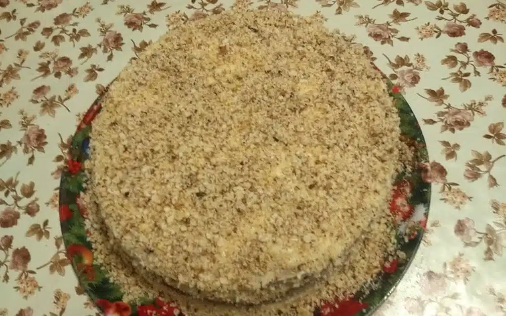 Оставям си малко крем, с който намазвам цялата торта и после я посипвам със ситно смлени орехи.