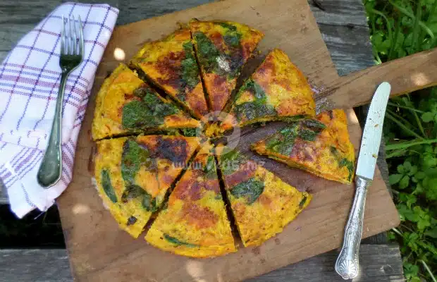 Гответе, докато стане златиста отвсякъде. Отново минете с нож по ръба. Оставете да престои поне 5 мин. в тигана. Извадете тортилята върху дъска и нарежете на парчета.