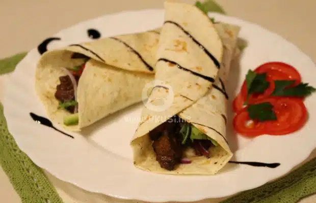 Намазваме топлите питки със соса от киселото мляко, сухия чесън, солта, черния пипер и магданоза. Върху него в средата на всяка питка слагаме от месото и нарязаните зеленчуци.