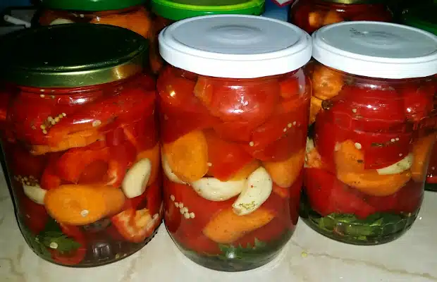 Поставете зеленчуците, като ги разпределите в бурканите, сложете по 1-2 листа целина и по няколко зрънца бахар и черен пипер. Между камбите и моркова мушнете и по 3-4 скилидки чесън. Пригответе маринатата, която е по указание на опаковката на фикса. Сипете в тенджера водата, оцета и захарта, добавете съдържанието на пакетчето сладко-кисел консервант и разбъркайте всичко. Оставете на котлона и варете 3-5 мин. като бъркате постоянно да се разтвори всичко в сместа. Отстранете от котлона и напълнете внимателно бурканите с горещата марината и затворете веднага с капачки.