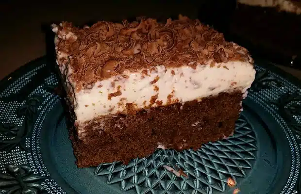 След като сладкишът е добре изстинал, сложете върху него цялата белтъчна смес, изравнете, поръсете с настърган шоколад и приберете в хладилник. Оставете сладкишът да се охлажда поне 12 часа, а най-добре за цяла нощ.
