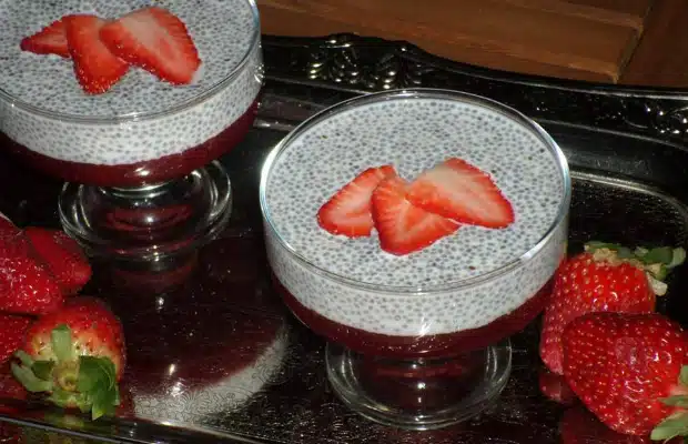 През това време нарежете измитите ягоди (заделете две или три) на малки парченца и ги пюрирайте с блендер. Разпределете ги в десертни чаши. Отгоре сипете млякото с чиата. Приберете за 7-8 часа на хладно. Декорирайте отгоре с резени от отделените ягоди.