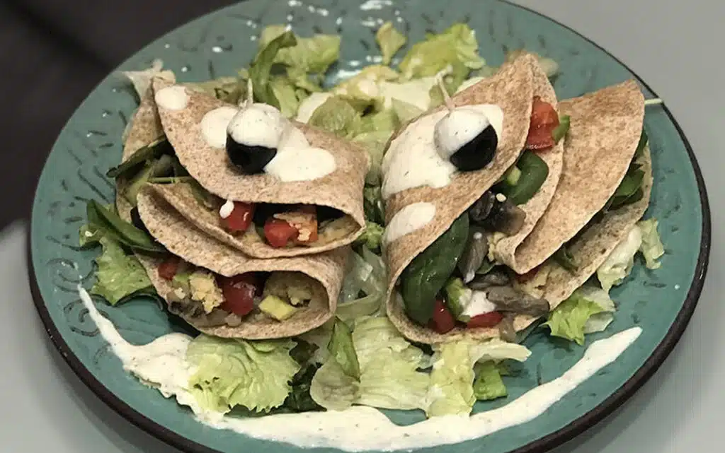 Сгъваме тортилята на две, за да се получи една голяма половина. След това прегъваме и нея на още две, за да придобие форма, наподобяваща тригълник. Накрая гарнираме със зелена салата (по желание) и веган чеснов сос.