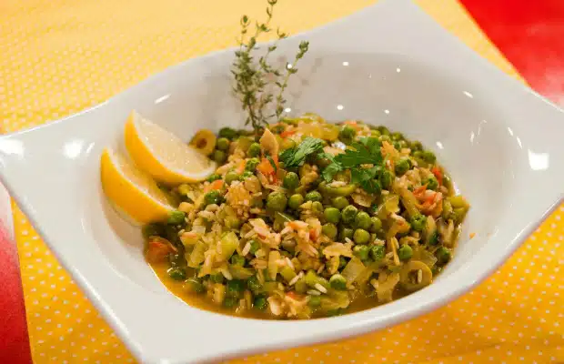 Нарязваме чушките, лука, чесъна, гъбите, доматите и артишока. Първо запържваме лука и чесъна в зехтин, след което добавяме ориза. Към него добавяме чушките, артишока и гъбите. Заливаме цялата смес със зеленчуков бульон. Прибавяме граха, домата и маслините. Подправяме с шафран, разтворен във вода, сол и черен пипер. Накрая поръсваме с магданоз, мащерка и лимонов сок. Сервираме.