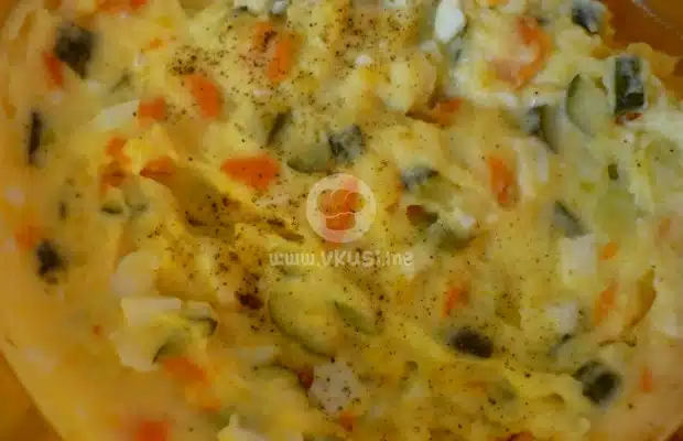 Зеленчуците се сваряват и се изцеждат. Добавят се киселите краставички, нарязани на дребно, и майонезата и отново се обърква добре. По желание се слагат и варени яйца. Сол и черен пипер на вкус.