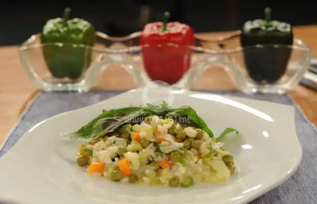 Добавяте ориза, посолявате и сипвате бульона малко по малко, като отново разбърквате, докато оризът се свари „ал денте“. След това добавяте всички зеленчуци, които вече сте сварили поотделно, и пълна шепа пармезан и нарязан босилек и магданоз.