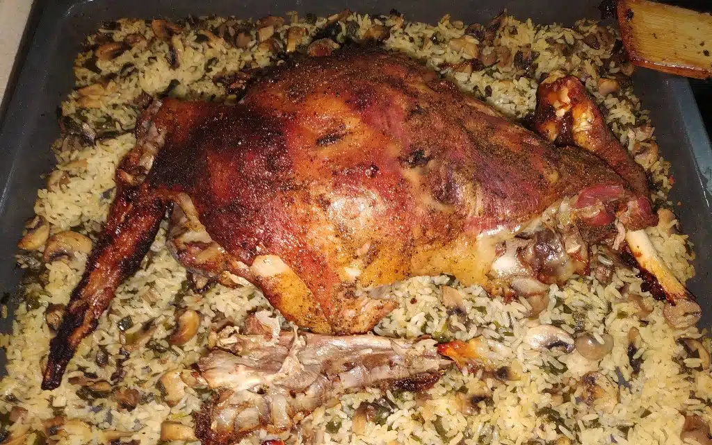 Когато сме готови, изсипваме ориза в тавата с агнешкия бут. Ако обичате по-мазничко, разбърквате с мазнината от бута. Ако не обичате, отцеждате мазнината и тогава добавяте ориза. Да ви е сладко!