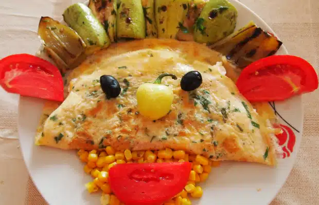 Затваряме омлета и сервираме със зеленчуци по желание. За украса тук са използвани маслини, домати, царевица, люта чушка, тиквички и чушки, предварително изпечени на плоча и мариновани в смес от зехтин, чесън, копър и магданоз.