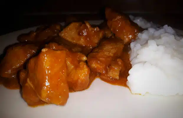 Добавяме доматеното пюре, чаша хладка вода, в която сме размили брашното и виното. Овкусяваме с останалите подправки и оставяме да къкри на умерен огън, докато не се сгъсти и до пълната готовност на месото. Гарнираме с картофено пюре или бял ориз по желание.