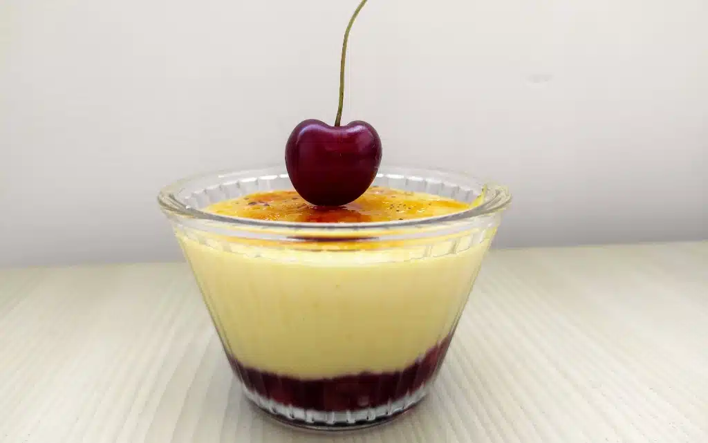 В подходящи купички поставяме от черешите, а отгоре заливаме с крема. След като се охлади достатъчно, поръсваме с малко захар отгоре и с помощта на горелка карамелизираме. Поднасяме веднага.
