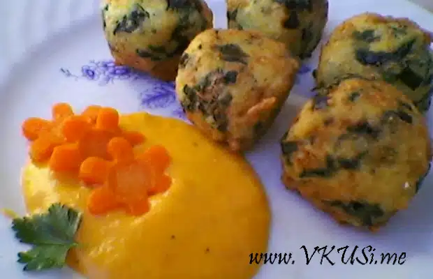 Оформяме кюфтенца, които овалваме в царевично брашно. Потапяме в разбити яйца и изпържваме. Поднасяме с крем от моркови, който приготвяме като нарязваме моркова и варим да омекне. Изваждаме в подходящ съд и заедно с малко вода, в която сме варили, пасираме на пюре.