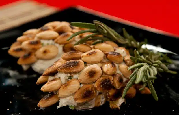 Нарязваме пресен лук. Смесваме със сиренето. Нарязваме и добавяме прошуто крудо и зехтин. Разбъркваме добре и поръсваме с черен пипер. Запичаме бадемите на сух тиган. Със сместа оформяме шишарки, добавяме малко сос „Уорчестър“ и нареждаме бадемите.