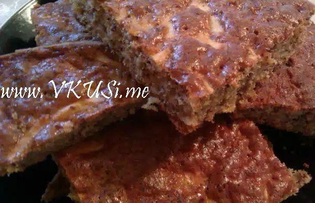 Разбивате яйцата със захарта и към сместа прибавяте брашното, олиото и бакпулвера. Бъркате с миксер до пълно хомогенизиране. Накрая се прибавят настърганите ябълки и смлените орехи, като полученото рядко тесто се разбърква с лъжица, така че всичко да се смеси добре.
