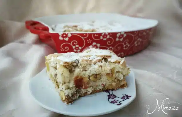 Яйцата и захарта се разбиват до побеляване. Прибавя се брашното, ванилията и настърганата лимонена кора. Разбива се до получаване на еднородна смес. Орехите и нарязаните на едро ябълки се прибавят към сместа. Разбърква се добре. Сместа се изсипва в намаслена и набрашнена тава. Пече се в предварително загрята на 180 градуса фурна до готовност (проверява се с клечка за зъби).