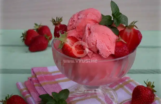 Преди сервиране извадете кутията да се отпусне за кратко. Сервирайте сладоледа в десертни чаши с парченца пресни ягоди.