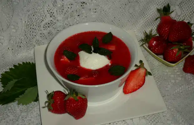 В 1 чаша ягоди има само около 50 калории. Освен това ягодите съдържат малки количества натрий и захар и никакви мазнини. Предлагам ви една чудесна идея за плодова супа, която е изключително освежаваща и атрактивна. Точно сега е моментът да ѝ се насладите. 🙂