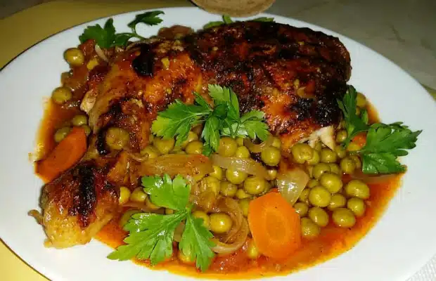 Тавата с полуизпечените бутчета се изважда от фурната и към тях се добавят грахът, заедно с течността от буркана, доматите, лукът, морковите и чесънът, черен пипер и зеленчуковата подправка и се покрива с фолио.
