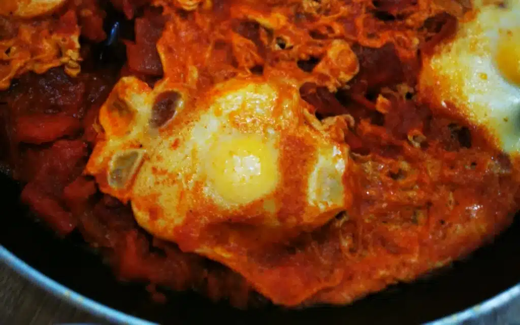 Нарязваме лука и чушките и ги запържваме, заедно с доматите. Овкусяваме с подправките и след това чукваме яйцата в сместа и похлупваме с капак, за да се забулят. Сервираме с поръсен магданоз.