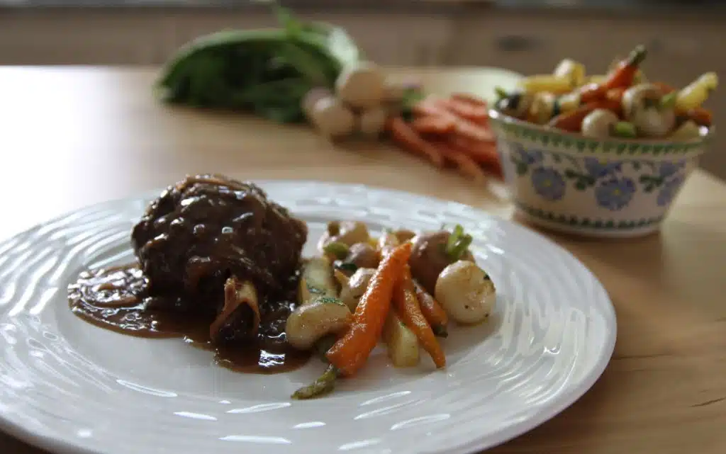 Сервирайте агнешки джолан и зеленчуци в дълбока чиния, поляти обилно със сос. Гарнирайте с пролетни зеленчуци в масло.