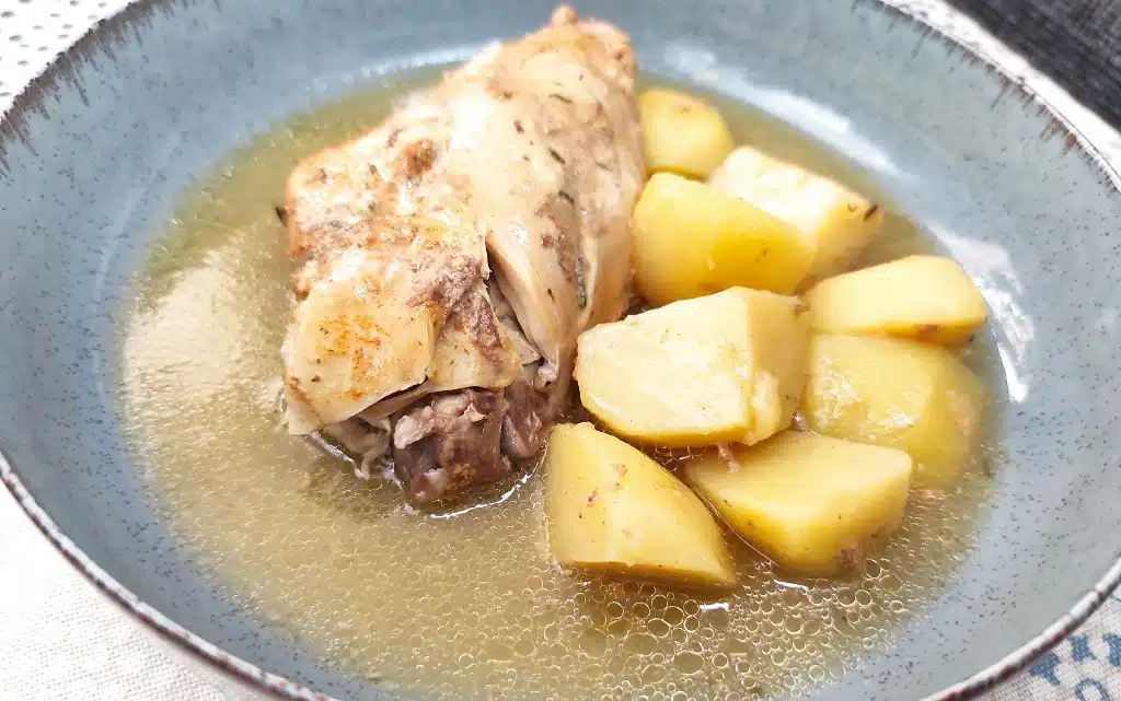 Печем във фурна за час и половина – два във фурна под фолио или за 5-6 часа на висока степен в уред за бавно готвене. След като ястието е готово, прецеждаме образувалия се сос. Поднасяме в дълбока чиния.