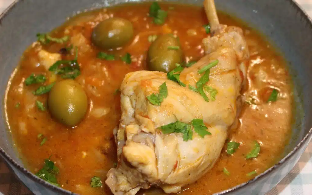 След като покъкри малко добавяме виното (или оцета) и маслините. Оставяме яхнията на бавен огън да къкри за 40-50 минути до час. Поднасяме със ситно нарязан магданоз.